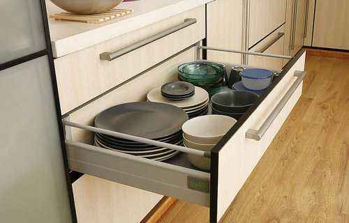 抽屜滑軌雖然是小部件,但卻是影響櫥柜質量的主要部件。所以選購時要注意抽屜和拉出式籃、架安裝是否穩固順暢,抽屜縫隙是否均勻。隨便打開一扇門、應做到順暢、無聲、輕巧、軟彈回。